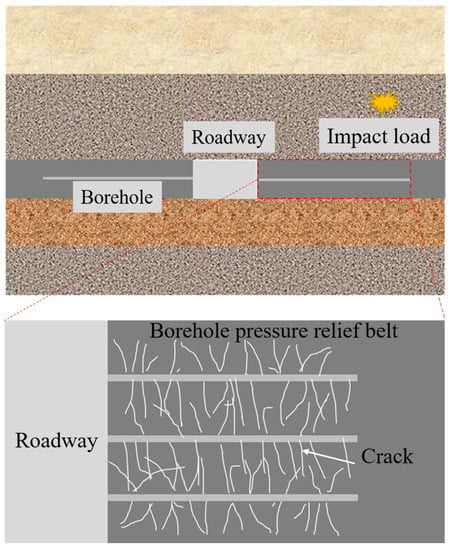 Rock burst is a world-class problem recognized by the mining and rock mechanics communities at home and abroad, and is one of the most serious dynamic disasters in coal mines [1,2,3]. Currently, China’s shallow high-quality coal resources are exhausted, and coal mining is gradually shifting to the deep part [4]. The deep coal rock is in a complex mechanical environment of high ground stress, high osmotic pressure, high temperature, and engineering perturbation, whose mechanical properties are different from those of shallow coal rock, and are susceptible to dynamic disasters such as rock burst, explosion of methane and coal dust, etc. With the increase in deep mining, the frequency and intensity of the occurrence of rock burst have been gradually increasing, which is one of the world’s underground engineering problems; it poses a serious threat to the safety of personnel and equipment, as well as the mining efficiency of the mines. The impact damage of coal rock after the initiation of rock burst is an obvious kinetic damage process with significant kinetic characteristics under high strain-rate loading, while the mechanical response of the roadway surrounding rock to the effect of high strain-rate loading determines the intensity of the impact damage, so it is particularly important to unload the deep elastic surrounding rock to reduce the destructive intensity of the impact. The core concept of pressure relief is to take measures to release the transferred stress in advance [5]. As a simple, economical, and effective method to prevent the impact of ground pressure, roadway boreholes have been widely used, which can reduce the stress state of surrounding rock and change the stress distribution of surrounding rock. The pressure relief zone formed after the borehole is broken has a weakening effect on the propagation of stress waves. Therefore, studying the mechanical properties of borehole-modified coal rock under a high strain rate can provide a reference for the stability of underground roadway surrounding rock.