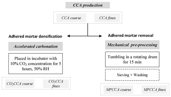The concrete waste was sourced from rejected prefabricated elements from an industrial facility. The crushed concrete aggregates (CCAs) were prepared by crushing concrete in a jaw crusher, followed by sieving the particles to obtain coarse and fine aggregate fractions. The aggregates were pre-treated via mechanical pre-processing and accelerated carbonation techniques according to the procedures in Figure 1; the aggregates are denoted MPCCA and CO2CCA, respectively.
