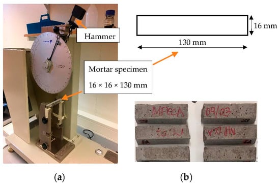 (a) Charpy testing apparatus and mortar specimen; (b) mortar specimens after fracture.