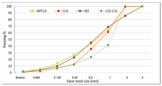 The cement used was CEM II/A-LL 42.5 R manufactured by CEMENTA, Sweden, and the superplasticizer was polycarboxylate-based with a dry content of 24% by weight; the proportions are shown in Table 1. The GGBS was a commercial product, Merit 5000, which was produced in Sweden. The mix containing GGBS with a w/c equivalent to 0.42 is denoted 0.42 SLAG. The GGBS influences the workability of the concrete, as seen via the increased slump values which may influence the hardened concrete’s properties [45]. No specific adjustments were made for the rheological properties of the GGBS mixes. The reference concrete mix (REF) was composed of natural aggregates (NAs). The coarse and fine aggregates were crushed stone and river sand, respectively. The recycled aggregates showed gap-grading so as to match the grading curve of the natural aggregates (Figure 4). Therefore, the 0/8 mm natural aggregate fraction in the reference concrete was replaced by two fine CCA fractions of 0/4 and 0.5/4 mm. The natural and recycled aggregate fractions which were investigated along with their concrete mixes are shown in Table 1. The mixing water, absorption water and superplasticizer contents were the same for the mortar and concrete recipes, respectively.