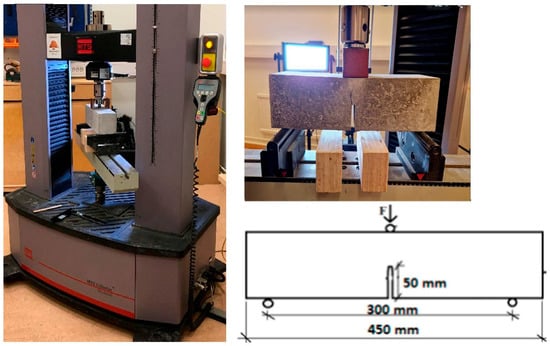 The compressive strength, elastic modulus and splitting tensile strength at 28 days were measured using three sets of 100 × 200 mm cylinders, according to SS-EN 12390-3 [46], SS-EN 12390-13 [44] and SS-EN 12390-6 [47], respectively. The elastic modulus was calculated as a secant on the ascending stress–strain curve between the stress value of 0.5 MPa and a second value corresponding to 30% of the compressive strength value. The fracture energy was tested using three-point bending tests on beams 350 mm long, with widths and depths of 100 × 100 mm, respectively, as shown in Figure 5. A notch with a thickness of 5 mm and a depth of 50 mm was sawn in the center of the beam just prior to testing to ensure a localized fracture. The experiments were performed using a uniaxial testing machine (MTS) with a load cell capacity of 100 kN. The deformation (δ) was measured in the center of the beam, using the crosshead movement. The loading was deformation-steered, maintaining a deformation of 1.8 mm/min at the center while ensuring that the peak load was reached within 60s. The load and deformation data were recorded until the beam separated in two halves.