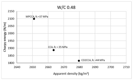 For the w/c ratio of 0.48, there is a good correspondence between the Charpy energy and compressive strength test results which can be summarized as follows: