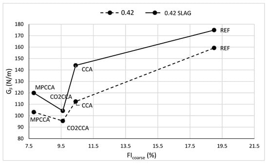 Concretes comprised of angular coarse aggregates show higher fracture energies compared to concretes containing spherical aggregates for aggregates of similar densities [25]. Mechanical pre-processing removes the adhered mortar and also reduces the flakiness of recycled aggregates; flakiness index results are shown in Table 2. The relationship between the fracture energy, GF, and the flakiness index of the coarse aggregate, FIcoarse, is shown for the 0.42 and 0.42 SLAG concrete mixes with a recycled coarse aggregate fraction of 8/11.2 mm in Figure 9. The 0.48 mix was not investigated as the flakiness index varies less among the 8/10 mm fractions from 7.7% for MPCCA to 9% for crushed stone in the REF mix.