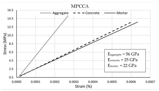 A graphical understanding of the influences of Eaggregate and Emortar on the elastic modulus of concrete, Econcrete, is shown via an arrangement of their respective stress–strain curves. The stress–strain curve for concrete is located in between the curves of the aggregate and mortar, respectively, as seen in the literature for natural-aggregate-based mortar and concrete in Neville, A.M. [21]. A similar representation is shown for MPCCA recycled aggregates in Figure 10.