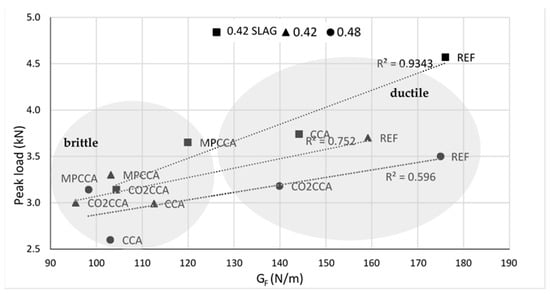 The fracture energy, GF, was calculated as the area under the load–deflection curve resulting from a three-point bending test on concrete beams. High GF values can result either from high peak load values or gradual and wide descending branches of the load–deflection curve. The GF values were analyzed against the corresponding peak loads and time to failure. The fracture energy shows a better correlation with the corresponding peak loads compared to the time to failure; the peak loads are plotted against GF in Figure 11.