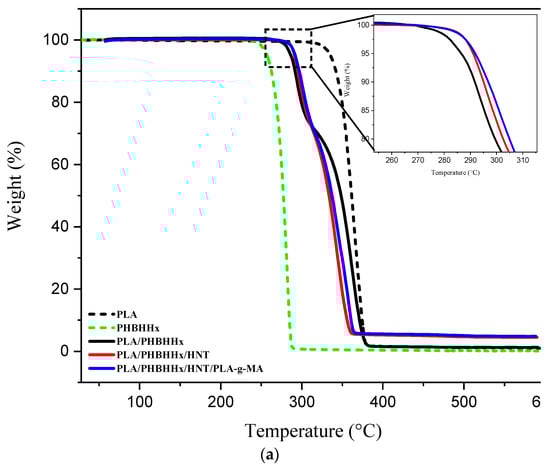 The thermal stability of PLA, PHBHHx, the PLA/PHBHHx blend, and PLA/PHBHHx/HNT in the absence and presence of a compatibilizer was investigated via TGA. The corresponding TGA and DTG thermograms are shown in Figure 5a,b, respectively. Further, Table 3 summarizes the main data.