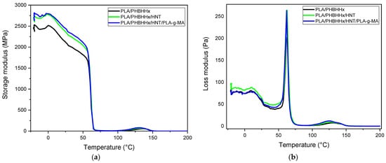 The absence of significant differences in the results of the dynamic mechanical analysis with the presence and absence of PLA-g-MA suggests that no substantial cross-linking or grafting reaction has occurred between PLA and PHBHHx. It should be noted that the absence of significant changes in the presence of PLA-g-MA does not necessarily negate the overall improvement in the mechanical properties or compatibility achieved by other means. The effectiveness of PLA-g-MA as a compatibilizer and the reinforcing effect of halloysite nanotubes may contribute to the overall improvement in the mechanical performance of the nanocomposite.