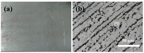 The substrate material used in the experiment was EH40 high-strength low-temperature steel, obtained from China Baowu Steel Group Corporation. The chemical compositions (wt.%) of EH40 steel were 0.16 C, 0.15 Si, 0.90 Mn, 0.10 V, 0.20 Cr, 0.02 Nb, 0.020 Al, 0.08 Mo, 0.35 Cu, 0.40 Ni, 0.02 Ti, and Fe balance. The EH40 steel was in the normalized condition and consisted mainly of polygonal ferrite (PF) and pearlite (P) structures. Prior to the cladding process, the surface of the EH40 steel was ground using 80# sandpaper to remove rust layers. Macroscopic morphology and metallographic structure of EH40 substrate steel are shown in Figure 1.