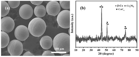 Co-based alloy powder (Höganäs, Shanghai, China) with the elemental composition (wt.%) of 1.4 C, 7.7 W, 0.2 Ni, 0.2 Fe, 27.6 Cr, 1 Si, and Co balance was used as the binder phase for the composite coatings. The micromorphology of the Co-based powder was observed using JEOL JSM-7500F scanning electron microscope (SEM, JEOL, Tokyo, Japan), and the powder phase compositions were examined by PANalytical X’Pert PRO X-ray diffractometer (XRD, PANalytical B.V., Almelo, The Netherlands) with a Cu-Kα radiation over a 2θ range of 20°–80°. The results of SEM and XRD are shown in Figure 2. Figure 2a shows that the powder has uniform particle size and good sphericity, ensuring smooth flow during the cladding process.
