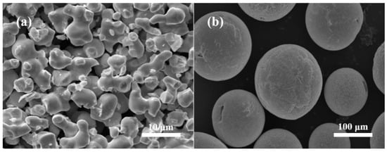 The SEM morphology of WB powder: (a) before spheroidization; (b) after spheroidization.