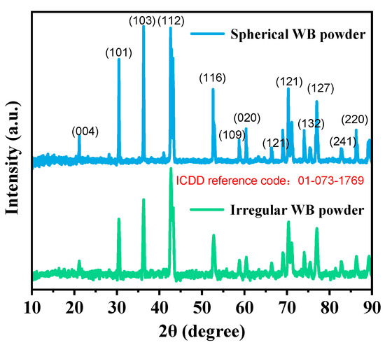 The scanning electron microscopy (SEM) morphologies of WB powder before and after spheroidization are shown in Figure 4. The spheroidization rate reached 99%, and the particle size ranged from 45 to 200 μm. Figure 5 presents the XRD patterns of WB powder before and after spheroidization. The principal phase compositions were identical, but the peaks in the XRD pattern of the spheroidized powder between 20° and 45° were sharper, indicating an improvement in crystallinity after spheroidization.