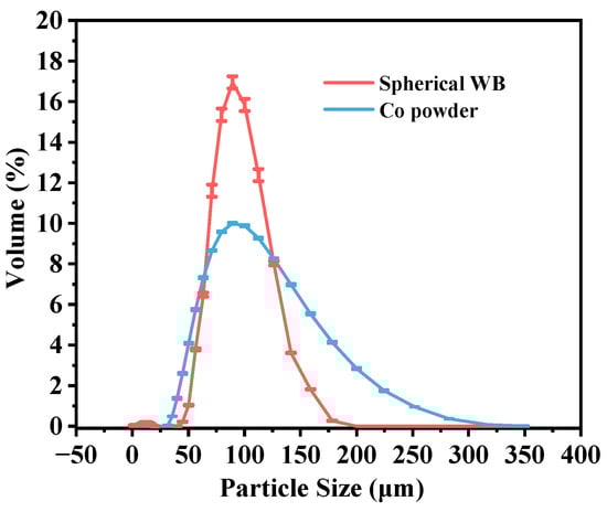 The Co-based alloy powder and the spherical WB powder were mixed in the predetermined ratio as shown in Table 2. The particle size distribution of the two powders is illustrated in Figure 6. The particle size of the Co-based powder ranged from 25 to 325 μm, while the spherical WB powder had a particle size ranging from 45 to 200 μm. Both powders exhibited a Gaussian distribution. The mixed powders were placed in a QM-3SP4 planetary ball mill (Nanjing Nanda Instrument Co., Ltd., Nanjing, China) for mechanical mixing to 1 h to ensure a homogeneous mixture of the two powders.