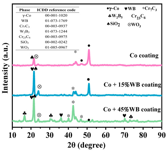Figure 8 shows the XRD spectra of Co-based WB coatings. The γ-Co (FCC) solid solution, Cr7C3, WO3, and SiO2 were detected in all coatings. Due to the addition of Cr, C, and Si elements in the Co-based powder, Si element oxidized to form SiO2 during the coating process. Si element exhibits self-melting behavior and its addition refines the alloy grains, promoting the transformation from equiaxed to dendritic structure [22]. Cr7C3 is one kind of carbide formed by the chemical reaction of Cr and C elements under laser energy. In addition to the Cr7C3 phase, intermetallic compounds such as Cr23C6 carbide was also detected, which play a role in dispersion strengthening of the coating. The Cr23C6 intermetallic compound has a complex cubic structure, which is relatively stable and requires high energy to form a new phase composed of atoms. It can also facilitate the long-range diffusion of other atoms. The intensity of the γ-Co diffraction peak significantly decreases with decreasing Co content. WB with a high melting point is not easily melted by laser energy, as seen in the spectrum where a significant amount of WB particles remain in the coating. It has been reported that WC can decarburize to form W2C and C under thermal reaction conditions [23]. As the content of WB gradually increases, a portion of WB will also decompose into W2B5. The W element reacts with oxygen to form WO3 oxide. A broadening diffuse scattering peak appears in the Co and Co + 15%WB coatings between 40° and 45°, indicating the presence of an amorphous structure.