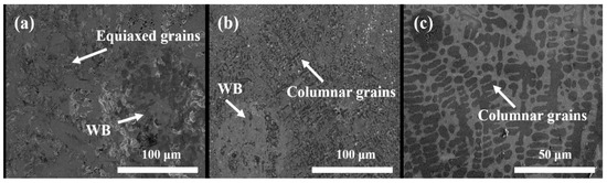 Figure 9 shows the surface microstructure of Co-based WB coatings. In Figure 9a,b, some voids and defects are observed within and around the WB particles. According to previous studies, during the rapid cooling process of the molten pool, some gases are trapped by WB and cannot quickly escape due to solidification at high temperatures [24]. Large areas of equiaxed grains are distributed around the spherical WB particles, and in the Co + 15%WB coating, predominantly fine equiaxed dendritic structures are present. For the Co + 45%WB coating, it can be observed that when a significant amount of large-sized WB particles is present, some columnar grain zones extend outward from the WB particles. This is attributed to the Particle Stimulated Nucleation (PSN) phenomenon [25] where a larger amount of WB particles can induce nucleation and accelerate recrystallization. Figure 9c reveals that the Co coating exhibits predominantly columnar dendritic microstructure, which is uniform and well-defined, with essentially no amorphous phase [26]. Without the reinforced spherical WB particles, the cobalt-based alloy powder absorbs more laser energy, resulting in a smaller temperature gradient during cooling, providing sufficient time for crystal growth and the formation of coarser columnar dendrites.