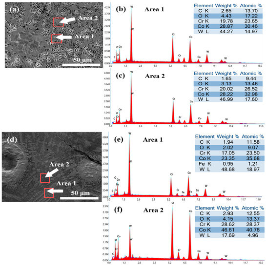 To gain a better understanding of the microstructural element distribution in the coating, EDS scanning analysis was conducted on the gray-black eutectic structure and white dendritic structure of the coating, as shown in Figure 10. The elemental distribution in the Co + 15%WB region is depicted in Figure 10a–c, revealing significant enrichment of Co and W elements around the spherical WB particles. The mass fraction of W element reached approximately 45%. Combined with the XRD results, numerous WO3 and SiO2 phases were distributed around the spherical WB particles. Additionally, some carbide reinforcement phases were surrounded by the γ-Co solid solution. Based on the atomic ratio of elements, the interdendritic structure mainly consisted of Cr7C3, while the white dendritic structure primarily comprised Cr23C6. The element content in the corresponding region of the Co + 45%WB coating is shown in Figure 10d–f. Combining the XRD results with the element content in the corresponding region, it can be determined that Area 1 was mainly composed of columnar grains with abundant elements such as Co, Cr, and W. The main components in this area were Cr7C3 carbide and WO3. Area 2 represents eutectic regions between columnar grains, where γ-Co dominated the composition, and Cr7C3 carbide and WO3 contributed to dispersion strengthening within the γ-Co matrix. With the presence of a larger amount of WB, the slower cooling rate allowed for the formation and precipitation of Cr7C3 carbide. The presence of larger particles in the molten pool inhibited grain growth, leading to compositional segregation and weakening of the directional growth of columnar grains.
