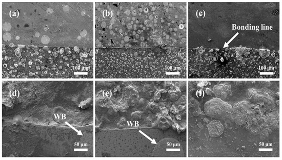 Figure 11 shows the SEM image of the cross-section of the laser-cladded coating. As shown in Figure 11a–c, there is a bright and fine bonding line between the cladding layer and the substrate steel, indicating a good metallurgical bond between the coating and the substrate [27,28]. The spherical WB particles added to the coating exhibited high sphericity and uniform distribution, and the coating showed no obvious cracks or pores. In the Co + 45%WB coating, the spherical WB particles were uniformly dispersed and fused in the γ-Co matrix, resulting in effective dispersion strengthening. After etching, the spherical WB particles in the coating showed no significant signs of corrosion, while different degrees of corrosion morphologies were observed in the dendritic and interdendritic eutectic structures around the WB particles.