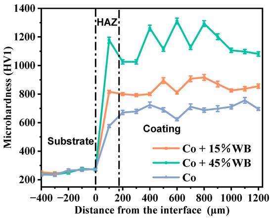 Microhardness information is an important indicator to analyze the mechanical properties of laser-cladded coatings [29,30]. To reveal the influence of spherical WB content on the hardness, the microhardness distribution of the coating in the depth direction is shown in Figure 12. The variation trend of microhardness of laser-cladding specimens can be divided into three distinct regions, namely the substrate zone, the heat affected zone (HAZ), and the cladded coating zone [31,32]. It can be seen that the microhardness of the cladded coating was significantly higher than that of the substrate, and the microhardness of the coating with the addition of spherical WB was also significantly higher than that of the Co-based coating. The average microhardness of Co + 15% WB, Co + 45% WB, and Co samples was, respectively, 3.28 times, 4.48 times, and 2.66 times to the substrate steel hardness (256.96 HV1). The average hardness of Co-based WB coating increased with the increase in WB content. When the coating contained 45% WB, the maximum hardness of the coating was 1152.01 HV1. The increase in hardness can be attributed to the strengthening effect of strengthening phases WB and Cr7C3 carbide. The microhardness of the Co + 45%WB coating fluctuates, indicating that more amorphous phases are generated in the Co + 45%WB coating, which has an impact on the hardness of the coating. The high hardness of Co-based WB coating is mainly due to the dispersion strengthening effect of WB on the coating. Meanwhile, the generation of carbides (Cr7C3 and Cr23C6) and γ-Co solid solution can significantly improve the microhardness of the coating and enhance the wear resistance of the coating. Previous studies have shown that the hardness of Co-based coatings with 30 wt.% WC addition is 411 HV0.2. When the addition amount is 60 wt.% WC, the hardness of Co-based WC coatings can reach as high as 701 HV0.2 [33]. The coating with spherical WB addition has higher hardness than the coating with WC addition, thus the development of Co-based WB coating has more application prospects.