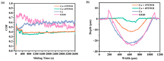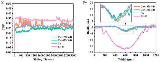 Figure 13a shows the coefficient of friction (COF) curves of three coatings (Co, Co + 15%WB, and Co + 45%WB) and the substrate EH40 steel in dry friction condition at −20 °C. The dynamic coefficients of the tested specimens are related to the state of the friction process. The wear resistance mainly depends on their hardness, surface microstructure, deformability, and crack propagation resistance [35]. During reciprocating friction and ball-on-disc wear processes, two wear stages can be distinguished: initial wear and steady-state wear. As shown in Figure 13a, during the initial running-in friction stage, the WC balls come into contact with the sample surface under the preset load, leading to a rapid increase in the friction coefficient between the coatings and the substrate steel. This may be attributed to the sudden increase in the contact area between the sample surface and the ball when subjected to compressive stress load, resulting in an increase in friction force with the contact area enlargement and plastic deformation on the sample surface [36]. As the friction process continues, the normal compressive stress gradually transforms into horizontal shear forces, and the friction enters the steady-state stage, where the fluctuations in the curve reduce to some extent. In particular, the Co + 15%WB and Co + 45%WB coatings exhibit a decreasing trend and tend to stabilize. This is because the spherical WB particles play a supportive role in the Co-based coatings. When encountering compressive stress, the spherical particles immerse into the alloy, effectively dispersing the stress. On the other hand, the coefficient fluctuations of the Co coating and EH40 are unstable. The friction between the friction surface and the ball causes the detachment of the hard phases and some metal coating, leading to changes in the friction state of the surface and affecting the fluctuations of the COF.