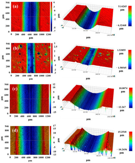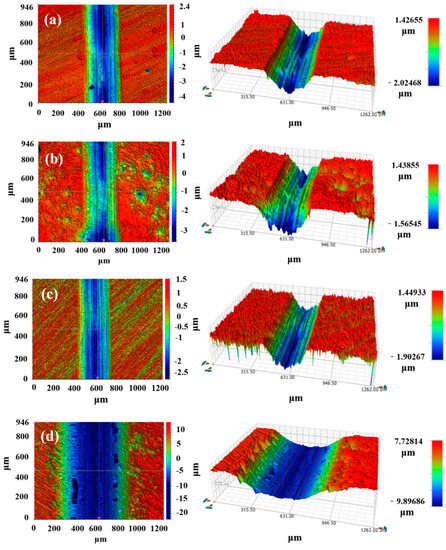 3D profile of wear tracks in 3.5 wt.% NaCl solution at −20 °C: (a) Co + 15%WB; (b) Co + 45%WB; (c) Co; (d) EH40.