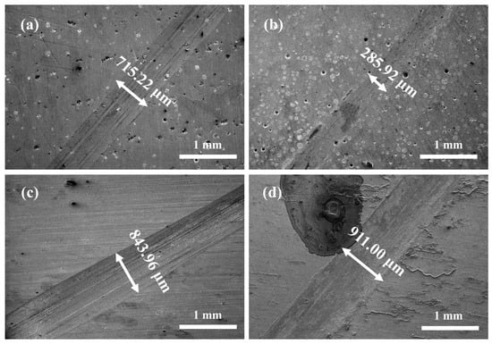 Figure 18 presents the SEM images of surface wear track in 3.5 wt.% NaCl solution at −20 °C. Due to the lubrication of 3.5 wt.% NaCl solution, the tracks on the surfaces of the three coatings are relatively shallow, exhibiting distinct elongated plough grooves. As shown in Figure 18a,b, there are evident voids resulting from the detachment of spherical WB particles within the scratches. The wear mechanisms of Co + 15%WB and Co + 45%WB coatings involve abrasive wear and abrasive particle erosion. The Co coating surface also shows noticeable scratches and some debris. The wear mechanism of the Co coating is attributed to abrasive particle wear. EH40 steel exhibits the poorest frictional performance, characterized by the largest depth and width of surface scratches, along with a considerable amount of residual wear debris. The wear mechanism of EH40 steel primarily involves fatigue wear.