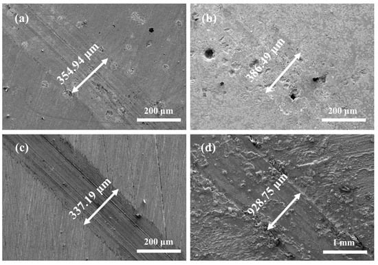 SEM profile of wear tracks in 3.5 wt.% NaCl solution at −20 °C: (a) Co + 15%WB; (b) Co + 45%WB; (c) Co; (d) EH40.