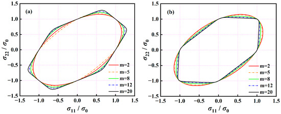 Normalized yield loci of the A-Eyld2000-2d yield criterion calculated using (a) isotropic mechanical properties and (b) a specific set of anisotropic parameters at different exponents m.