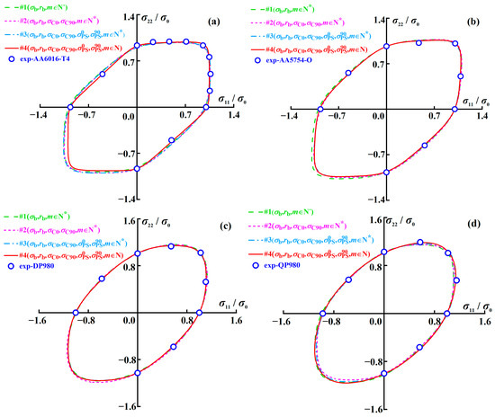 Normalized yield loci of (a) AA6016-T4, (b) AA5754-O, (c) DP980, and (d) QP980 blanks predicted by A-Eyld2000-2d yield criterion with different parameter identification strategies.