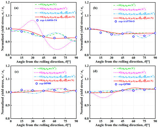 Normalized UT yield stresses of (a) AA6016-T4, (b) AA5754-O, (c) DP980, and (d) QP980 blanks predicted by the A-Eyld2000-2d yield criterion with different parameter identification strategies.