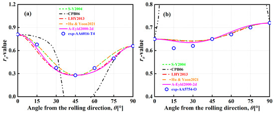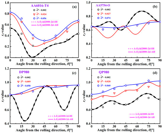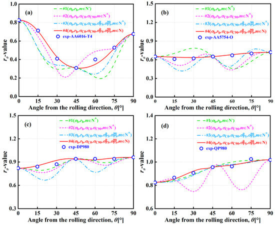 r-values of (a) AA6016-T4, (b) AA5754-O, (c) DP980, and (d) QP980 predicted by several asymmetric yield criteria.