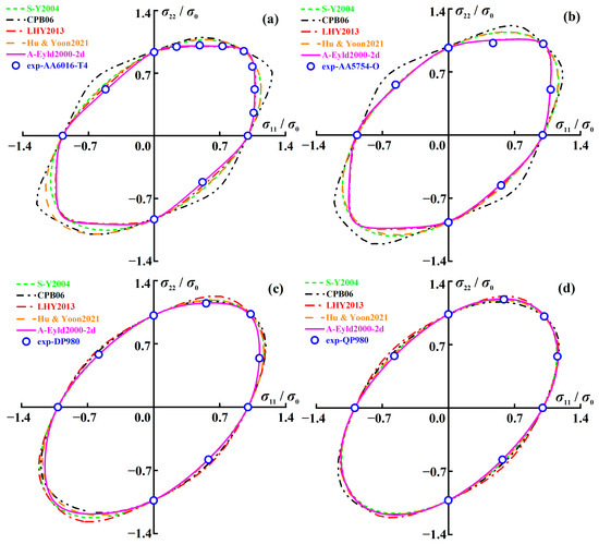 Normalized yield loci of (a) AA6016-T4, (b) AA5754-O, (c) DP980, and (d) QP980 blanks predicted by several asymmetric yield criteria.