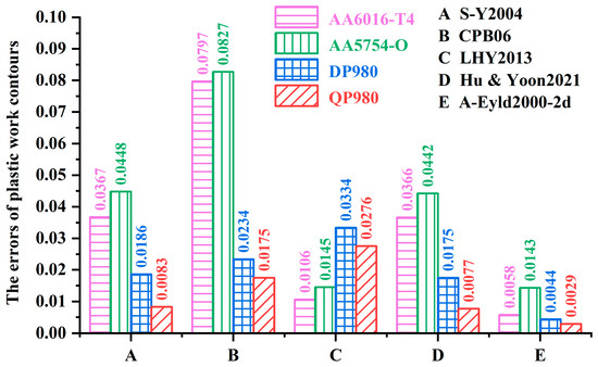Figure 6 shows the normalized yield locus of AA6016-T4, AA5754-O, DP980, and QP980 blanks predicted by several asymmetric yield criteria. CPB06 shows significant deviation when describing the yield loci of AA6016-T4 and AA5754-O, as shown in Figure 6a,b. However, for DP980 and QP980, the errors of normalized yield loci predicted by the five asymmetric yield criteria are relatively small, and the differences are mainly reflected in the SS and NPS stress states, as shown in Figure 6c,d. In addition, it can also be observed that S-Y2004 and Hu & Yoon2021 have very similar abilities to describe the normalized yield loci of four blanks, and their prediction accuracy is always better than CPB06 under NPS and SS stress states. To further quantitatively evaluate the ability of five asymmetric yield criteria to describe the normalized yield loci of four blanks, the errors between the normalized yield loci and experimental data are calculated by Equation (11).