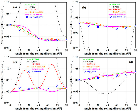 Normalized UT yield stresses of (a) AA6016-T4, (b) AA5754-O, (c) DP980, and (d) QP980 predicted by several asymmetric yield criteria.
