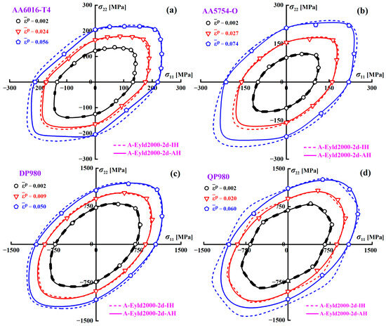 Yield loci of (a) AA6016-T4, (b) AA5754-O, (c) DP980, and (d) QP980 blanks predicted by IH and AH concepts at various EPSs.