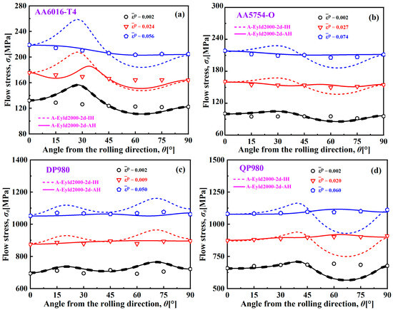 Figure 11 shows the UT yield stresses of AA6016-T4, AA5754-O, DP980, and QP980 predicted by the A-Eyld2000-2d yield criterion based on the IH and AH concepts at various EPSs. For AA6016-T4 and QP980, because the curve shapes of UT yield stress predicted by the IH concept are calculated through the anisotropic parameters at the initial yield point, the prediction accuracy gradually deteriorates with the increase of equivalent plastic strain, while the accuracy of UT curves predicted based on the AH concept gradually improves, as shown in Figure 11a,d. Meanwhile, it can also be observed that the curve obtained based on the AH concept is more stable with the continuous increase of EPS, which makes the prediction accuracy of UT yield stresses at 15° intervals along the RD much higher than that of the IH concept. This indicates that the prediction effect of the A-Eyld2000-2d yield criterion based on the AH concept on the UT yield stresses of four blanks become increasingly excellent.