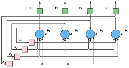 Firstly, the topology of the neural network is determined. In this article, the topology is a feedback-type neural network structure in which each neuron simultaneously feeds its own output signal back to other neurons as an input signal, and it takes a while to work to reach stability. Hopfield neural networks (HNN) belong to this type [29], shown in Figure 1. The number of neurons, layers, inputs, and outputs for the network are also determined.