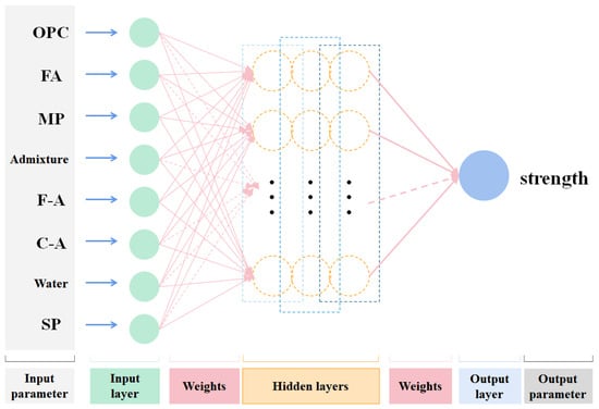 Artificial neural networks (ANNs) are a typical ML model inspired by the structure and function of the human brain [21]. ANNs consist of a network of interconnected nodes, or neurons, which receive inputs, process information through mathematical operations, and produce output signals [22,23]. Each neuron is connected to other neurons via weighted connections, which determine the strength of the signal between them. The output of each neuron is determined by applying an activation function to the weighted sum of its inputs. The most used activation functions include the sigmoid function, the hyperbolic tangent function, and the rectified linear unit (ReLU) function.