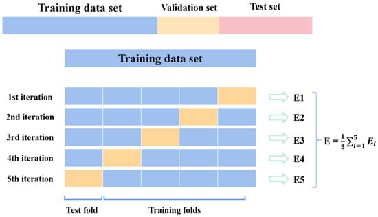 The preprocessing of the dataset generally consists of two parts: one is the reasonable division of the dataset, and the other is the normalization or standardization of the dataset. The dataset is divided mainly to complete the training and testing of the model, and the common allocation rates for training, validation, and testing are 60%, 20%, and 20%, as shown in Figure 5. The training set is used to train the model, and the validation set is aimed to verify its accuracy. Finally, the trained model is applied to predict the testing set and analyze and compare the predicted value with the true value. The min-max scaling and Z-score standardization of input and output data are designed to prevent premature saturation of coverage and hidden nodes between numbers of different sizes, which are shown in Equations (21) and (22).