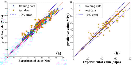 The GA-ANN model was trained and evaluated by dividing the dataset into training, validation, and testing datasets. The error analysis shows that the GA-ANN model has excellent learning and fitting performance. To further verify the optimization effect of GA on the network structure, an ANN model with the same number of hidden layers and neurons was built to compare with GA-ANN. The prediction value is shown in Figure 7, and the loss value of the two models is listed in Table 5. For machine learning models, most of the errors between predicted values and experimental values were within the margin of ±10% [36], in which a large dispersion can be observed. Figure 7a shows the prediction results of the compressive strength for GA-ANN, which agrees well with the true value. GA-ANN achieves excellent testing results (R2 = 0.95) and the value of ANN (R2 = 0.80), indicating high accuracy in predicting concrete strength. These results suggest that the ANN model optimized by GA has better prediction accuracy than the ANN model alone, and the correlation coefficient R2 increases by about 15%. This finding demonstrates that GA can optimize the structure and parameters of neural network models and improve their prediction performance. GA searched for a better network structure by increasing, decreasing, or changing the connection mode between the layers and obtained the number of hidden layers in the neural network and the number of neurons. Moreover, GA can optimize the parameters of the neural network, but the resulting optimization result is usually a parameter combination rather than the visual graph structure, so it is difficult to show the details clearly. In summary, GA can improve prediction performance, providing an effective method for the practical application of concrete performance prediction.