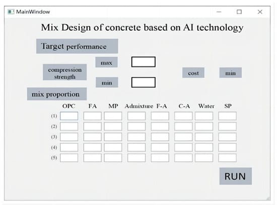 In recent years, the rapid development of AI technology has greatly accelerated the process of intelligence and information in all walks of life and brought new opportunities and challenges to traditional industries [39,40]. In this study, a GA-ANN model combined with the Scipy model is developed for performance predicting and multi-objective design. However, despite the excellent performance of different kinds of AI technology ML models in concrete mixture design, it still has some problems in its practical application. In particular, the application of the GA-ANN and Scipy models is limited due to the lack of simple and efficient graphical user interface (GUI) software (V1.0). Therefore, based on the construction and research of GA-ANN and Scipy, this paper further builds a concrete mixture design system based on AI technology, as shown in Figure 8.
