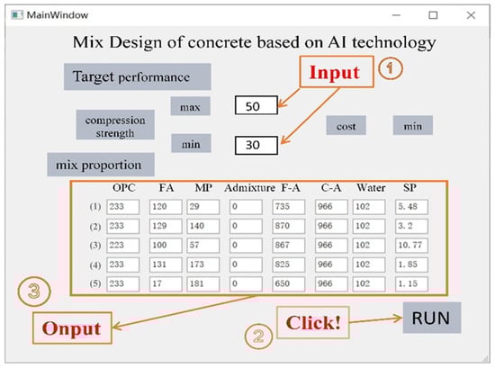 As the database grows larger and the complexity of ANN increases, computers need to have greater computing power, which is coordinated computing via a personal computer and a cloud computing server. The concrete mixture design system uses a GUI, which can obtain some concrete mixture design schemes, that satisfy the highest compressive strength and the lowest cost. The input module of the system includes cement (OPC), fly ash (FA), mineral powder (MP), other admixtures (AD), fine aggregate (F-A) and coarse aggregate (C-A), superplasticizer (SP), and water (W), and the output module is concrete mixture design schemes. The expert evaluation system provides great assistance and convenience for engineers and researchers because the performance prediction and the design results are based on the modeling of 487 tests in the database. The researcher can verify the test according to the mix ratio provided by the model and then adjust it according to the experience, reducing a lot of manual attempt time. In addition, through the design of GUI, researchers and engineers are also able to enrich the performance of concrete through the GA-ANN model and Scipy library, such as mobility, durability, toughness, etc., to better adapt to actual needs, and will conduct more in-depth research and exploration in the future.