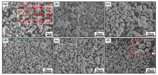 SEM micrographs of powders: (a) TiC powder and particle size distribution; (b) 17-4PH stainless steel powder; (c) 17-4PH + 3 wt% TiC; (d) 17-4PH + 5 wt% TiC; (e) 17-4PH + 10 wt% TiC; (f) 17-4PH + 15 wt% TiC.
