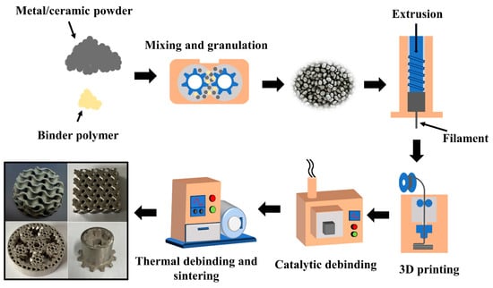 Figure 2 shows the process flow of metal fused filament fabrication. First, the metal-ceramic powder was mixed with the binder and pelletized by an integrated mixing and pelletizing machine (MH-10L-DCSS-H, Genyilong Machinery Equipment Co., Ltd., Qingdao, China). The mixing and pelletizing machine applied a three-screw working mode (two forward-rotating and one reverse-rotating), which ensured uniformity in the mixing of metal-ceramic powders and binders. Following pelletization, the pellets were heated to 170 °C in a filament extruder (FLD-25A, Flanders Machinery Co., Ltd., Zhangjiagang, China) and extruded through a screw to produce 3D-printed filaments with a diameter of 1.75 mm ± 0.03 mm. The filaments were printed as 3D-printed samples by an FFF printer (Pro2, Raise3D, Shanghai, China), and Table 2 shows the parameters of the 3D printing process.