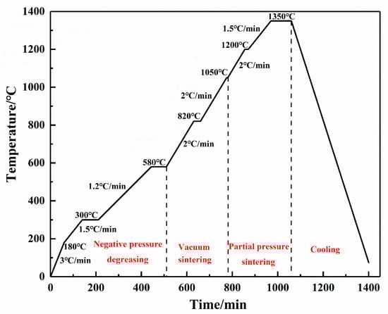 The 3D-printed samples were degreased from paraformaldehyde by oxalic acid- catalyzed degreasing oven (CD-2200A, Sibairui Automatic Control Equipment Co., Ltd., Ningbo, China) at a degreasing temperature of 120 °C and a degreasing time of 8h. Thermal degreasing and sintering of the degreased specimens were carried out in an atmospheric sintering furnace (Hechuan Technology Co., Ltd., Wuxi, China). Figure 3 shows the thermal degreasing and sintering process.