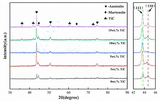 Figure 4 shows the X-ray diffraction patterns of TiC-17-4PH composites with different TiC contents. Without the addition of TiC particles, the XRD diffraction peaks mainly consist of austenite and martensite phases, and the diffraction peaks intensities do not differ much. The intensity of the martensitic phase XRD diffraction peaks decreases with increasing TiC content in comparison to the austenitic phase. The main reason for the decrease in martensite content may be the uniform dispersion and partial dissolution of TiC powder within the matrix, where element C can act as a strong austenite stabilizer to maintain the austenite organization up to room temperature [32], and therefore, the relative content of austenite phase increases significantly with the addition of TiC powder. Due to the low TiC content and the decomposition of partial TiC during high-temperature sintering, only austenitic and martensitic phases were observed in the diffraction peaks of 3 wt% TiC, and almost no TiC phase was detected.