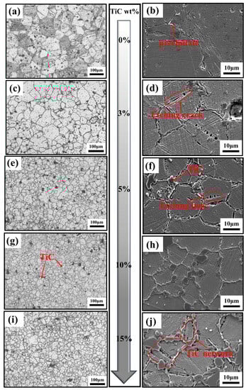Surface morphology of the sample after etching: (a,b) 17-4PH +0 wt% TiC; (c,d) 17-4PH + 3 wt% TiC; (e,f) 17-4PH + 5 wt% TiC; (g,h) 17-4PH + 10 wt% TiC; (i,j) 17-4PH + 15 wt% TiC.