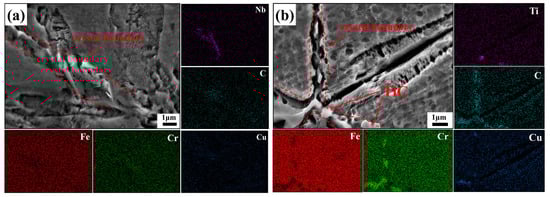 Figure 5 depicts the metallographic organization of sintered specimens of the original powder with varying TiC concentrations. When the TiC content is 0wt%, the microstructure of the sintered specimens is primarily lath martensite and austenite, as shown in Figure 5a,b. As shown in Figure 5c–j, the content of martensite in the specimen drops rapidly with the addition of TiC ceramics, almost no obvious martensitic organization can be detected, and the microstructure is mainly constituted of austenite. This is consistent with the results of XRD diffractograms. It can be observed through Figure 6 that Cr, Nb, and Cu elemental segregation clearly appeared at the grain boundaries of the composites. This is due to the high temperature sintering process, in which a small portion of TiC particles decomposed into Ti and C melted into the alloy, resulting in serious lattice distortion while also making some of the solid solution in the matrix solubility decrease, resulting in the production of Cr, Nb, and other compounds. The addition of TiC produces micropores and microcracks in the metallographic etching process (Figure 5d,f), which is due to a large number of defects within the lath martensite, such as dislocations, vacancies, etc., which may produce a large number of hole erosion sources during the metallographic etching process and thus are prone to etch holes and cracks.