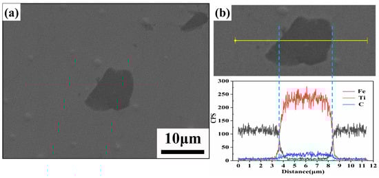 Figure 5 shows that there is a gap between the TiC particles and the matrix. However, it should be emphasized that the samples used to take the metallographic pictures were deeply etched for 5 min in order to show the microstructural features, and the gaps were caused by the etching. In fact, as shown in Figure 7a, in the non-etched sample, the TiC particles were firmly attached to the 17-4PH matrix. This is due to the fact that the wetting angle between TiC and stainless steel is only 30° at high temperatures [35], so the two materials have good bonding. Through the elemental line scan analysis of TiC and its surrounding region in Figure 7b, it can be shown that the TiC particles region is enriched with Ti and C elements, while the 17-4PH stainless steel region has fewer Ti and C elements. In the interfacial region between TiC and the 17-4PH matrix, the interdiffusion between Ti and Fe elements forms a transition layer, which indicates that good metallurgical bonding between TiC and the base metal can be obtained. The interface between TiC particles and the 17-4PH matrix is the key to fully utilizing the particle reinforcement. Compared to mechanical bonding, good metallurgical interfacial bonding helps to weaken the effect of the interface on load transfer, thus increasing the overall strength of the composite. Weak interfacial bonding, on the other hand, is prone to initiating cracking, which in turn leads to component failure under load, resulting in interfacial fracture, ceramic particle detachment, and interfacial corrosion damage, thus weakening the reinforcing effect of the ceramic particles and leading to the deterioration of the composites’ abrasion and corrosion resistance [36].