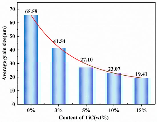 Figure 8 shows the average grain size of TiC/17-4PH composites with different TiC additions in Figure 5 using ImageJ (1.54 d) statistics, where the measurement method is the linear intercept method, the values are the average of five measurements, and the red curve shows the trend of the average grain size. Combined with the metallographic diagram in Figure 5a, it can be seen that the average grain size in the sintered specimen without TiC addition is relatively large, reaching 65.58 μm. Micron-TiC particles refined the grain size of the 17-4PH organization. When the TiC content continued to increase to 15 wt%, the average grain size of the 17-4PH stainless steel tissue decreased to 19.41 μm. This indicates that the incorporation of micron-TiC particles can impede the growth of dendritic crystals and form a pegging effect on the grain boundaries, significantly reducing the grain size of the matrix tissue, which can be explained by the Zener theory of grain growth [37]. In addition, when the TiC content is low, the reinforcing phases are distributed in the composites in a relatively isolated manner. With the increase in TiC content, the reinforcing phases gradually increase, interconnect with each other, and are distributed in the matrix in the form of a network, as shown in Figure 5j. The network structure can more effectively prevent the growth of matrix grains compared to individual particles [38], especially for samples with 10–15 wt% TiC added.