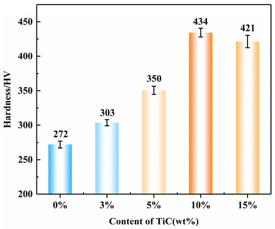Figure 11 shows the hardness of samples with different TiC contents. Apparently, the hardness of TiC reinforced composites increased with the increase of TiC content (0–10 wt%). The 10 wt% TiC sample exhibited the highest microhardness of 434 HV. The hardness of the 15 wt% TiC samples was slightly reduced due to pore defects and TiC agglomeration in the specimens. The primary reasons for the increase in hardness after the addition of TiC are as follows: (1) Second phase strengthening: The high-hardness TiC ceramic particles (3000 HV) can inhibit the plastic deformation of the 17-4PH steel matrix and restrict the movement of dislocation, thus significantly increasing the hardness [39]; (2) Fine grain strengthening: The fine grain strengthening is generated by the addition of TiC. According to Tabor’s empirical equation (H~3σ) and the Hall–Petch equation (σ = σ0 + kd−1/2), where H and σ are the overall hardness and strength of the tested material, respectively, and d is the diameter of the grain [40]. It can be concluded that the refined microstructure leads to a significant increase in hardness; (3) The mismatch of thermomechanical properties at the interface between TiC particles and matrix can easily lead to the formation of a large number of dislocations, which produces a dislocation-strengthening effect and improves the hardness of the specimen; (4) Solid solution strengthening: The solid solution effect of Ti atoms can improve the hardness by deforming the lattice structure, clamping dislocations, and hindering dislocation movement [41].