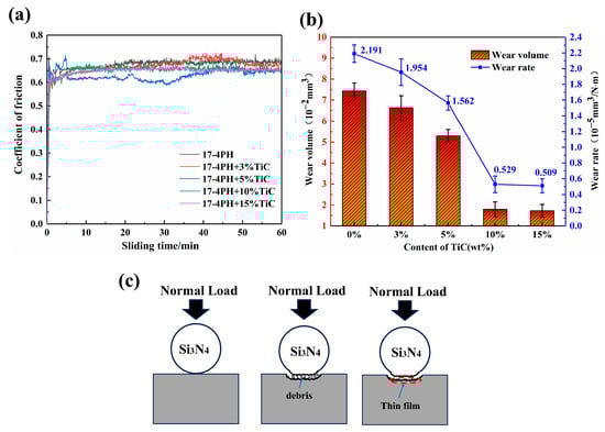Figure 12a shows the friction coefficient curves of different TiC contents. It can be observed that the five groups of specimens exhibit similar trends in the variation of friction coefficients. It can be clearly seen that the COF value declined with the addition of TiC. The initial low COF was due to the presence of contaminants on the mating surface. During the running-in phase, the oxide layer on the surface of the specimen was destroyed, and the coefficient of friction increased rapidly. Since the surface roughness of the specimen was not uniform, the friction coefficient appeared to fluctuate for a period of time. As the wear process proceeded, the surface roughness of the specimen tended to be consistent, and the wear process reached the stable phase [39,42].